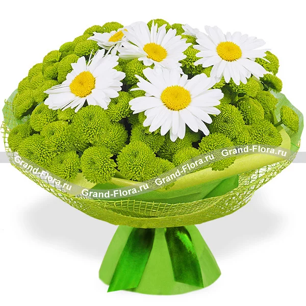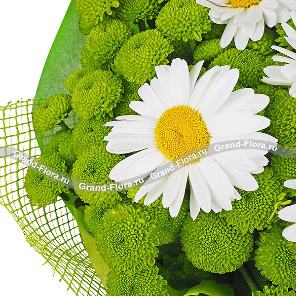 ЛЮКС: хризантема кустовая зеленая - 11 шт, ромашка белая - 12 шт, фетр зеленый, сетка зеленая.