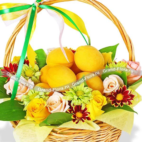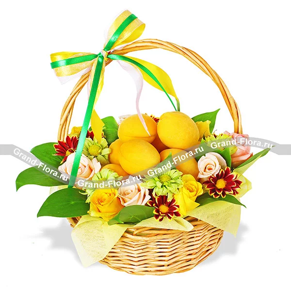 роза розовая (маленький бутон) - 4 шт., роза желтая (маленький бутон) - 5 шт., хризантема мелкоцветная зеленая - 1 шт., хризантема бордовая - 1 шт., рускус - 2 шт., фетр желтый, оазис, корзина малая, бант желто - зеленый, абрикос - 1 кг.