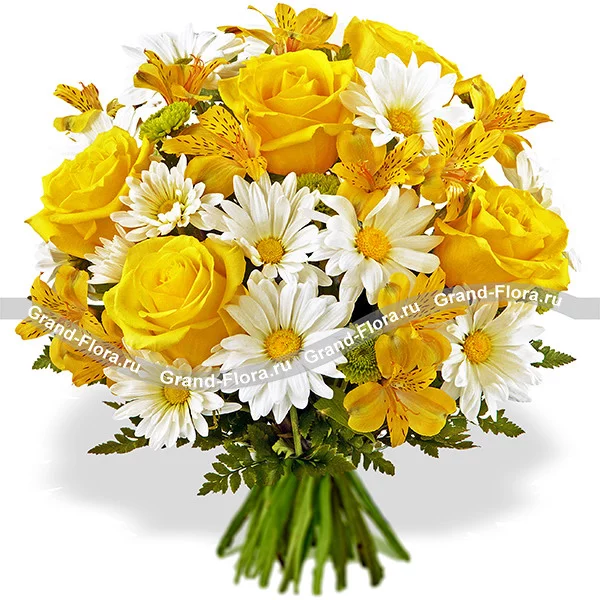 Люкс: роза желтая - 7 шт., хризантема белая кустовая - 3 шт., хризантема зеленая (сантини) - 3 шт., альстромерия желтая - 4 шт., папоротник - 3 шт., упаковка. Примерный размер: 30Х30 см.